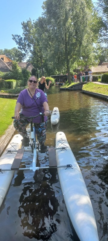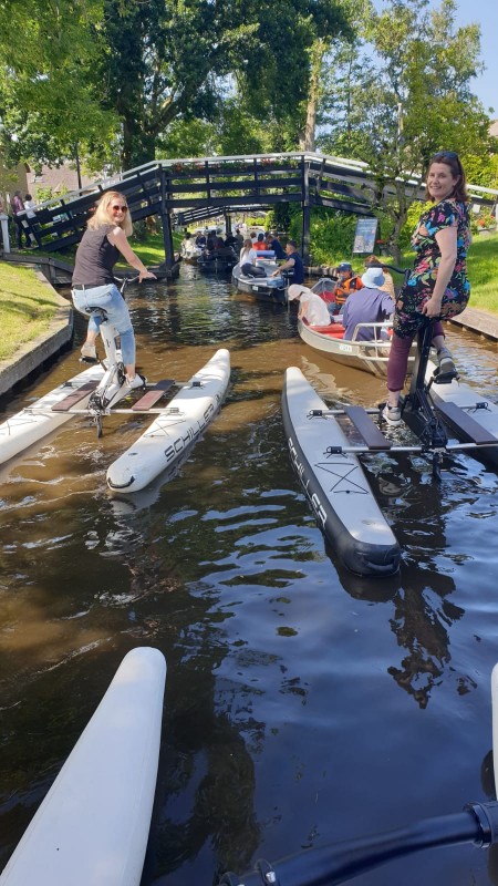 De speciale Schillerfietsen liggen echt heel stabiel in het water. Ik zal eerlijk zeggen dat ik het doodeng vond om op te stappen, maar ze kiepen echt niet om. Het fietsen zelf qua zwaarheid valt te vergelijken met gewoon fietsen. Het leuke is dat je sneller bent dan de fluisterboten. Je bent wel echt een attractie op het water, ik denk dat Yvonne van Vegalifestyle, Lisanne van gezinmetvijf en ondergetekende wel door 100 mensen op de foto zijn gezet. Met een uurtje kun je een klein rondje door Giethoorn doen, inclusief het meer. Een hele bijzondere ervaring om te doen in Giethoorn met kinderen.